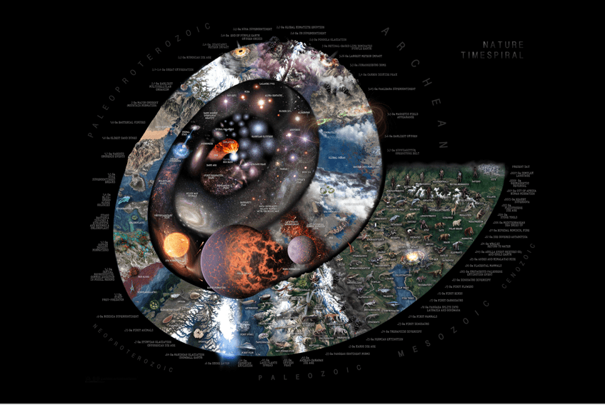 Clairement, beaucoup de choses se passent lors de cette dernière « minute cosmique ». La totalité de l’histoire humaine, en fait! La préhistoire, quant à elle, tient en gros dans les deux dernières heures. L’existence des mammifères tient dans la dernière semaine, alors que la vie a mis des mois à émerger. Ce qui ressort de tout cela, c’est une idée d’accélération globale de la complexité: le développement des organismes complexes fut beaucoup plus rapide que celui des organismes simples.