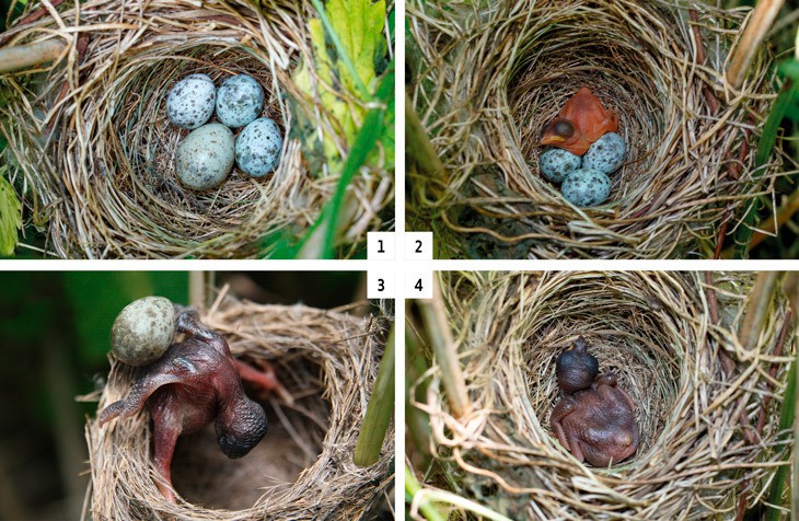 Le coucou pond son œuf dans le nid d’un autre oiseau (1). L’œuf de coucou éclot avant les autres (2). Le jeune coucou jette les autres œufs en dehors du nid (3). Il est alors seul dans le nid (4).