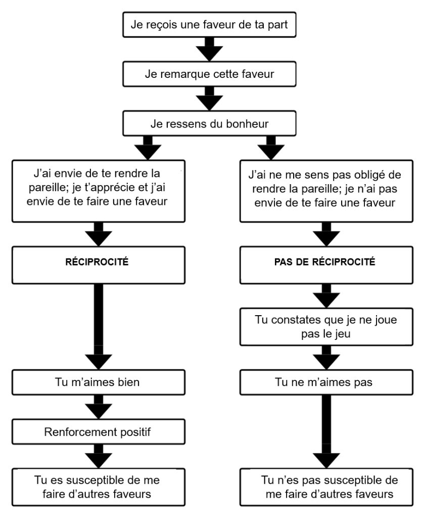 Coopération et altruisme réciproque. L’altruisme réciproque implique une situation dans laquelle un individu agit en faveur d’un autre individu à un certain coût, par exemple en partageant de la nourriture ou en prenant un risque pour signaler un prédateur à ses congénères. Ce genre de sacrifice apparent n’est pas fait totalement gratuitement (ce qui à terme coûterait beaucoup trop à celui qui donne), mais dans l’attente d’une réciprocité future.