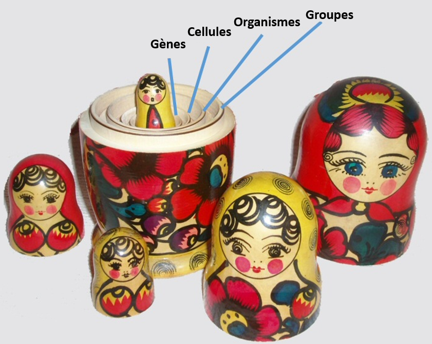 Dans l’article Émergence de la complexité, nous avons déjà évoqué certains processus de coopération entre certaines « briques élémentaires » du vivant. Par exemple, la coopération entre gènes qui s’associent en chromosomes, la coopération entre organelles qui s’organisent en cellules ou la coopération entre cellules qui s’assemblent en organismes pluricellulaires. La théorie dite de la « sélection multi-niveau » intègre tous ces éléments et pousse la logique un cran plus loin, en considérant que certaines pressions évolutives peuvent se situer au niveau du groupe.