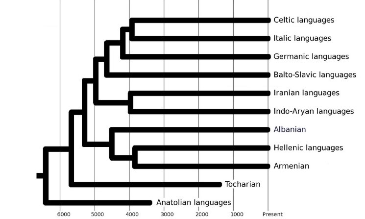 Prenons l’exemple du langage. L’évolution du langage est souvent représentée par des diagrammes tels que celui de la figure ci-dessous, qui mettent en évidence les liens de parentés entre différents langages et la séparation en différents types, d’une manière très similaire aux arbres phylogénétiques qui représentent l’évolution et les liens entre différents espèces du vivant. Tous les langages ont un ancêtre commun et s’organisent en famille et sous-famille. Certains de ces ancêtres communs sont peu distants dans le passé, d’autres beaucoup plus, jusqu’à remonter par exemple à un langage commun à toutes les langues indo-européenne, voire plus lointainement encore, à tous les langages existants.