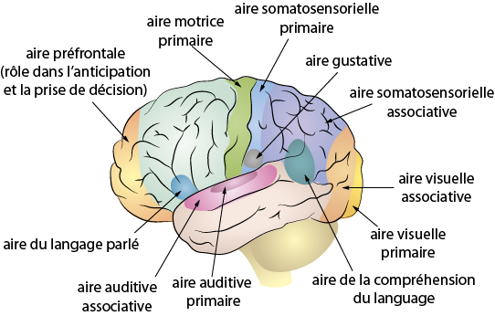 Plus spécifiquement, le cortex est organisé en différentes aires cérébrales, qui ont chacune une spécialisation fonctionnelle. Certaines aires ne sont présentes que d’un côté. L’aire du langage, par exemple, est présente dans l’hémisphère gauche chez la plupart des gens. D’une manière générale, on retrouve des aires cérébrales associés à la perception (aire visuelle, aire auditive, etc.), des aires associées à la motricité, ainsi que des aires spécialisées dans les fonctions cognitives de haut-niveau, telle que l’aire préfrontale. Cette dernière est la plus récente d’un point de vue évolutif; c’est également celle qui se développe le plus tardivement, n’arrivant à maturité qu’au début de l’âge adulte.