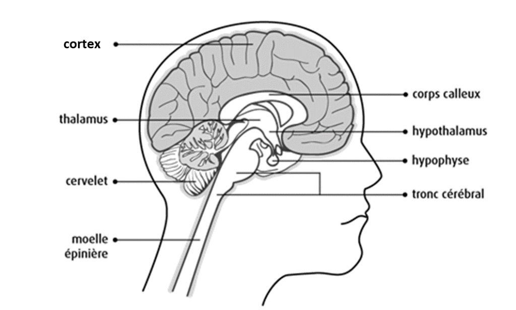 Enfin, le cortex est la structure la plus récente, apparue il y a environ 200 millions d’années. Il est à l’origine des fonctions cognitives dites de haut-niveau (attention, planification, raisonnement, etc.). Le cortex, représente 80% du cerveau chez l’humain. D’un point de vue anatomique général, le cerveau est symétrique et organisé en deux hémisphères (gauche et droite), reliée entre elles par une structure appelée le corps calleux. D’un point de vue fonctionnel, les deux hémisphères ne sont toutefois pas totalement identiques. Ceci est surtout vrai pour le cortex, ne serait-ce que parce que l’hémisphère gauche gère la perception et la motricité du côté droit du corps, et inversement.