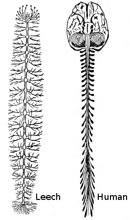 Structure segmentaire du système nerveux chez la sangsue (à gauche) et chez l’humain (à droite)