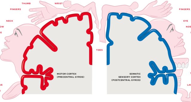 Homoncule moteur et homoncule somatosensoriel. Les parties du corps sont proportionnelles à la surface de cortex qui leur est dédiés.