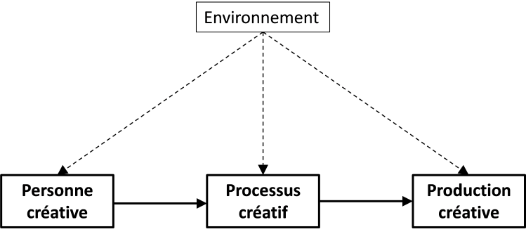 - la production créative, qui représente le produit fini et qui renvoie à la question des critères utilisés pour définir ce qui est créatif ou non (originalité, pertinence, etc.).