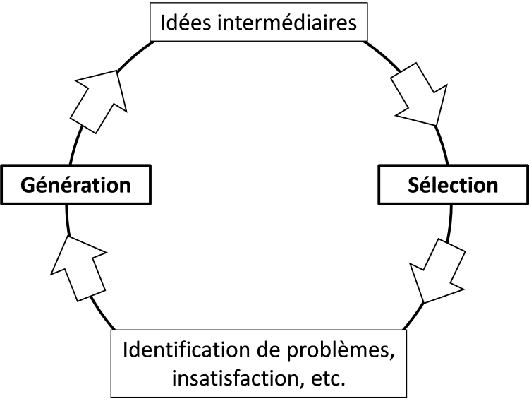 Le processus créatif dans son ensemble est donc dialectique ou itératif. Des éléments provisoires issus de la génération sont explorés et évalués par les processus de sélection. Si le but de la tâche n’est pas atteint ou que la solution n’est pas assez satisfaisante, l’exploration des idées intermédiaires permet d’identifier leurs forces et leurs faiblesses, afin de les améliorer. À ce moment-là s’engagent alors des cycles de génération et sélection. L’élaboration de la production créative se fait ainsi à travers ces cycles itératifs.