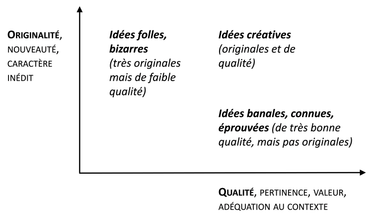 Au-delà de la difficulté à définir précisément ce que sont la nouveauté et la qualité, l’essentiel est de retenir que ces deux critères, sous une forme ou une autre, sont essentiels à la créativité. En effet, les idées ou les productions qui sont très originales mais pas du tout pertinentes sont juste bizarres, alors que celles qui sont très pertinentes mais pas du tout nouvelles sont tout simplement banales.