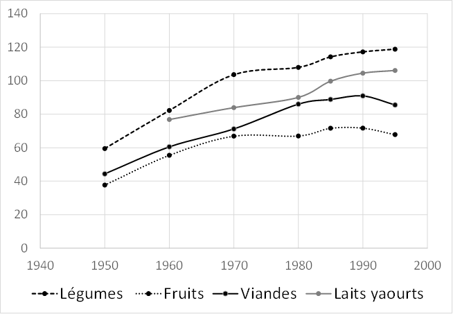 Au 20e siècle, les habitudes alimentaires ont énormément évolué. Divers progrès technologiques ont permis une production, une conservation et une distribution incomparablement plus efficaces que par le passé. La disponibilité de tous les aliments a été fortement accrue, et ce y compris dans les dernières décennies. En France, dans la seconde moitié du 20e siècle, la consommation par habitant de fruits, de légumes, de viande et de produits laitiers a quasiment doublé (Figure 21).