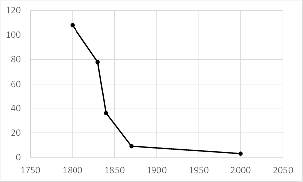 Évolution de la durée d’un trajet Paris-Lyon, en heures, de 1800 à 2000