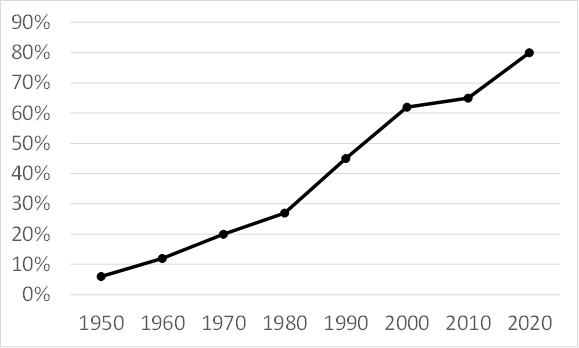 De nos jours, environ 80 % des jeunes Français ont le bac, contre moins de 10 % dans les années 1950. Les chiffres pour les études supérieures sont tout aussi impressionnants. En France toujours, le nombre d’étudiants a triplé entre 1958 et 1968, passant de 227 000 à 695 000. Aujourd’hui, quelque cinquante ans plus tard, ces chiffres sont de l’ordre de 3 millions. Rien qu’entre 2010 et 2020, les effectifs ont progressé de 500 000, soit une hausse de 20%.[14]