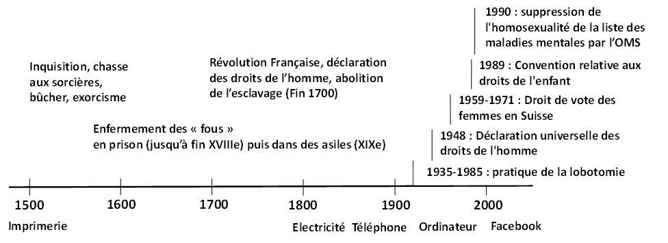 Du point de vue de la violence et du respect des droits humains, les choses se sont donc nettement améliorées. Au cours des 16e et 17e siècles, bon nombre de pratiques barbares étaient fréquentes – torture judiciaire, chasse aux sorcières, Inquisition, esclavage, enfermement des « fous » dans des prisons, etc. À cette époque, on était loin des questions liées au confort dans les logements ou à l’accès aux fruits et légumes évoqués plus haut dans ce chapitre. Et même ce que l’on considère aujourd’hui comme des acquis fondamentaux sont en fait extrêmement récents. Dans les années 1950, le droit de vote des femmes n’était pas acquis dans tous les pays européens, la violence « éducative » vis-à-vis des enfants était encore banale et tolérée, l’homosexualité était considérée comme une maladie, le sexe hors mariage était souvent mal vu et les méthodes contraceptives peu efficaces.