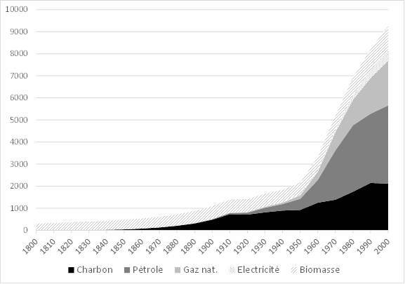 Pour chiffrer la quantité d’énergie utilisée par l’humanité, on utilise le million de tonnes d’équivalent pétrole (Mtep). Dans les années 1800, l’humanité consommait environ 300 Mtep, essentiellement sous forme de biomasse (bois, par exemple). Dans les années 1900, on utilisait trois à quatre fois plus d’énergie, environ 1100 Mtep. En plus de la biomasse, on utilisait beaucoup de de charbon, mais encore assez peu de pétrole et de gaz. Dans les années 1950, le pétrole est de plus en plus utilisé ; on dépasse les 2000 Mtep, soit environ 7 fois plus qu’en 1800. Dans les années 2000, le pétrole devient l’énergie principale. La consommation d’énergie totale se situe autour de 9 000 Mtep. Dans les années 2020, on se situe autour de 15 000 Mtep.[1]